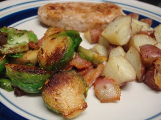 While this was going on, I made the brussel sprout dish in a 12" skillet, and then transferred this to a bowl when it was done. I used the leftover oil to cook the pork chops.  The bacon and onion flavor really brought out a nice taste to the pork chops, which I seasoned with salt, pepper and rosemary.